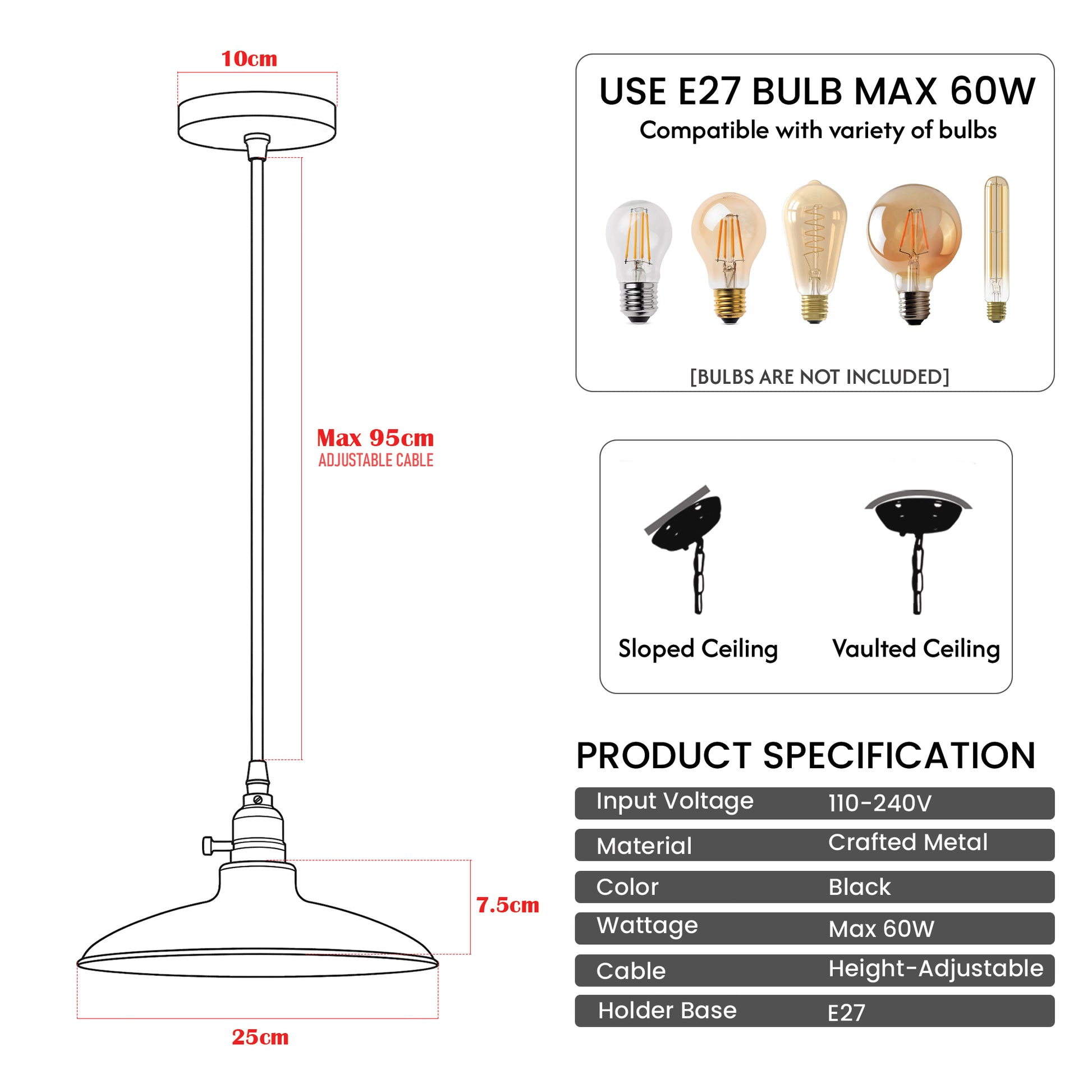 - Das verstellbare 95-cm-Kabel ermöglicht eine flexible Aufhängehöhe für Kücheninseln, Esstische oder die Beleuchtung im Flur.