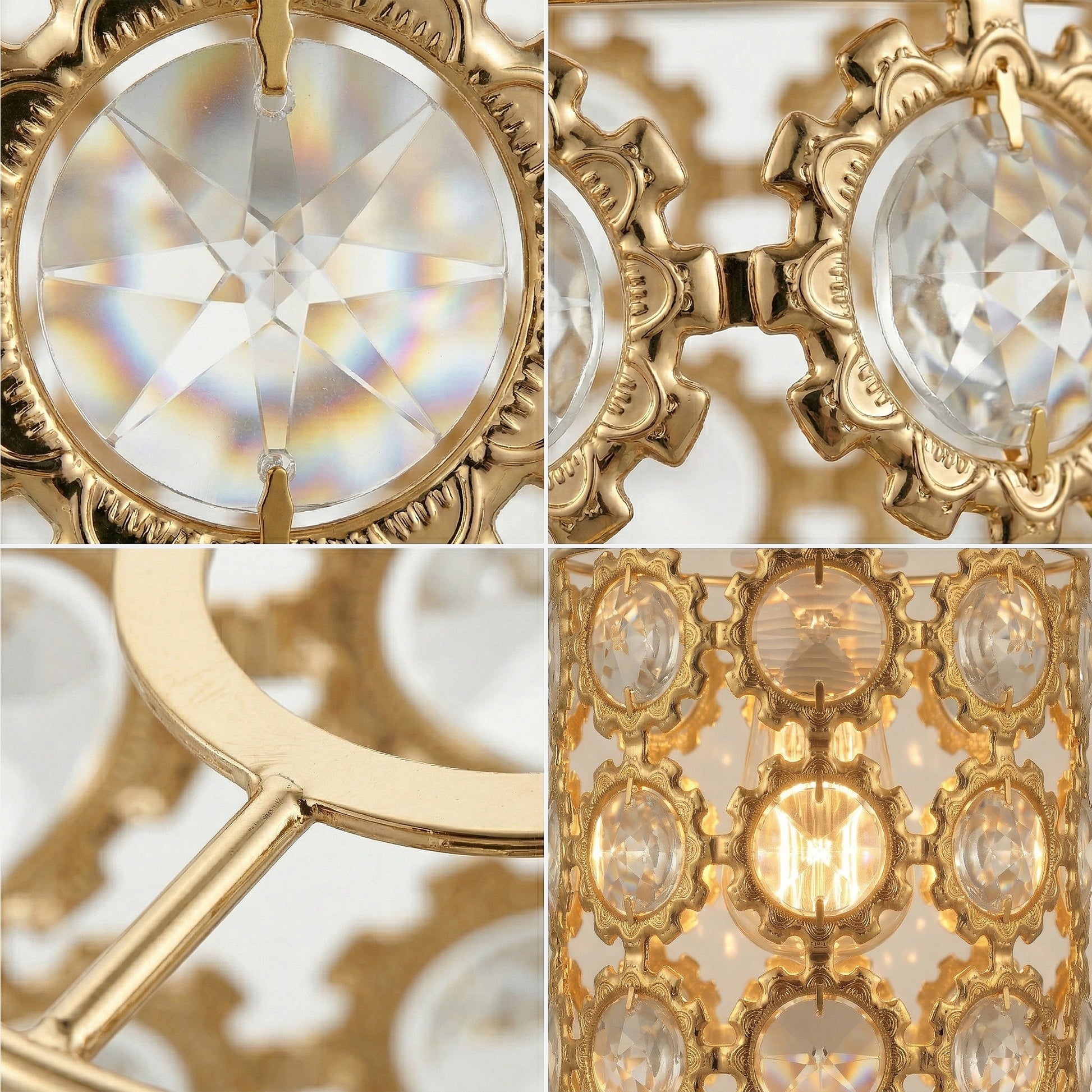 - La struttura in metallo dorato con dischi di cristallo crea un effetto luminoso radioso e scintillante.