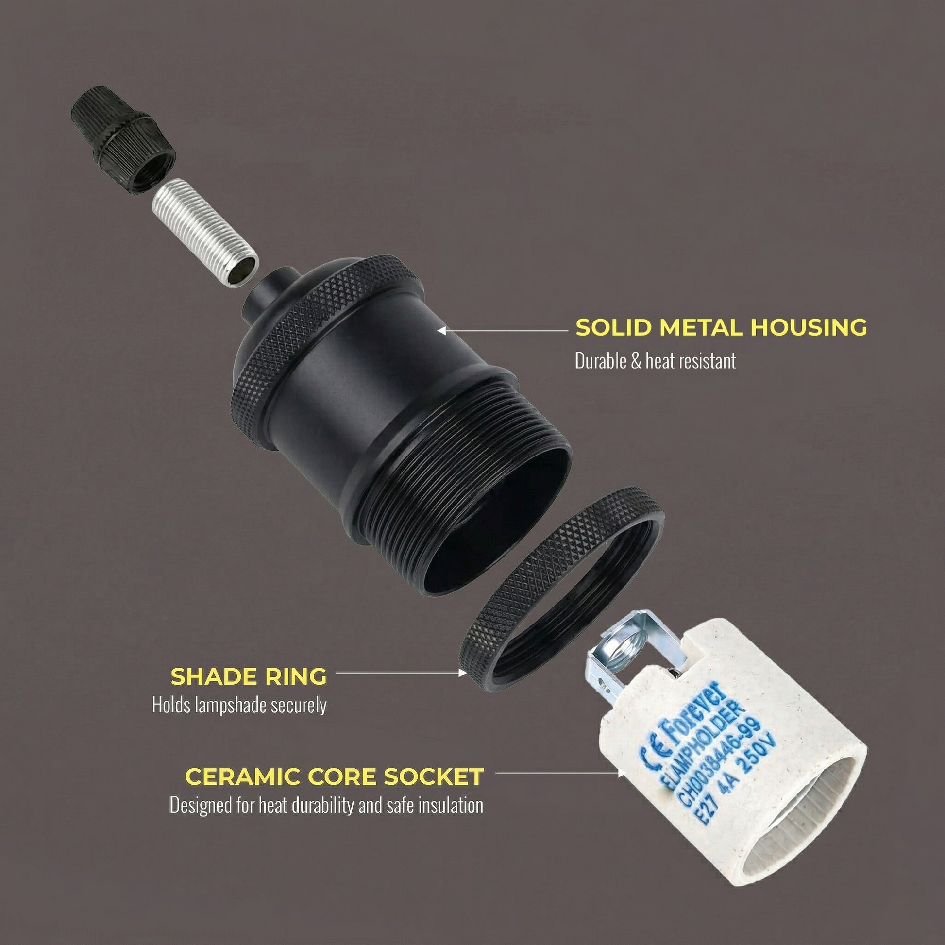 - 1 × Attacco E27 in metallo con nucleo in ceramica