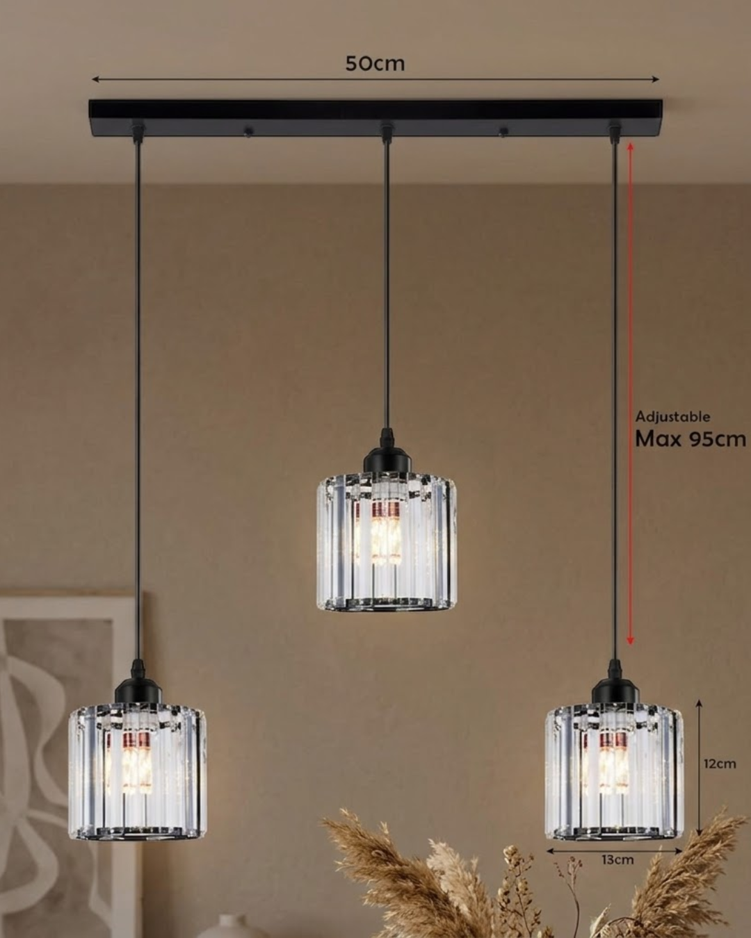 - Dimensioni: Rosone rettangolare a soffitto (50 cm di larghezza), paralume in cristallo (12 cm di altezza, 13 cm di larghezza) e lunghezza del cavo di 95 cm – ideale per ambienti di piccole e medie dimensioni.