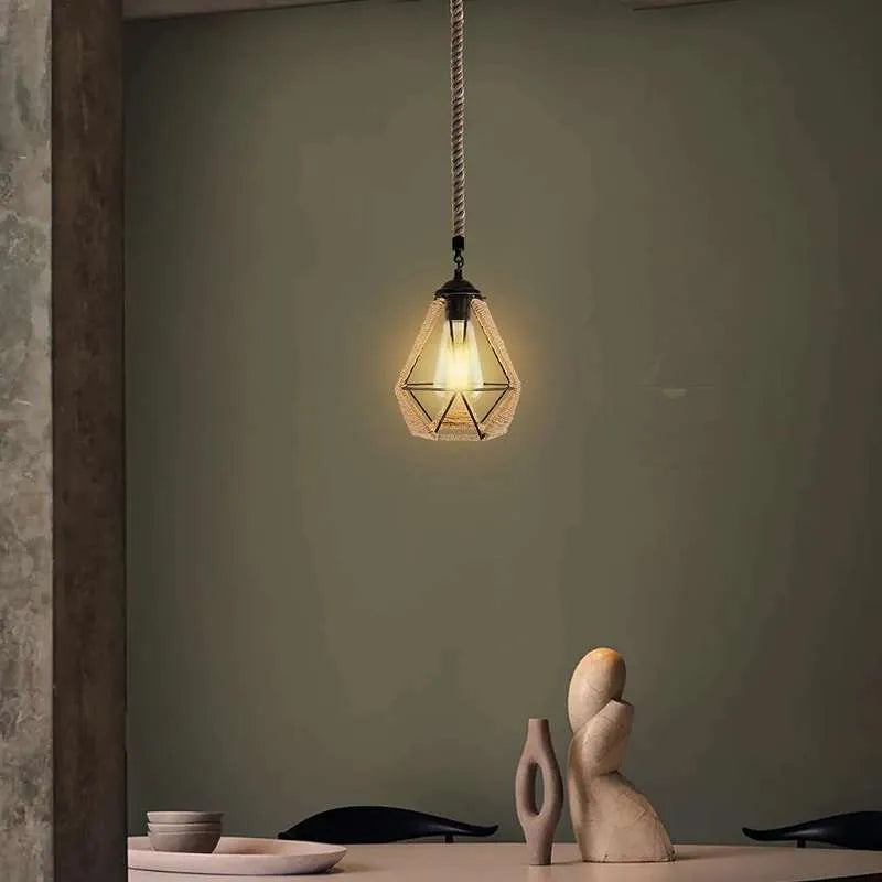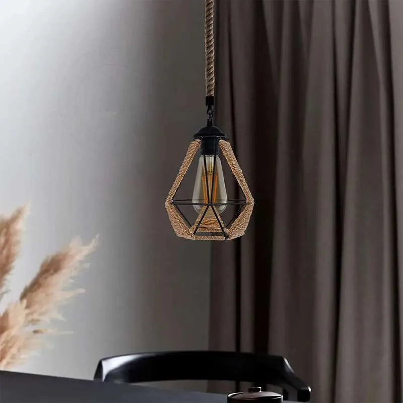 Industrielle Vintage-Pendelleuchte Hanfseil & Metallkäfig~2633