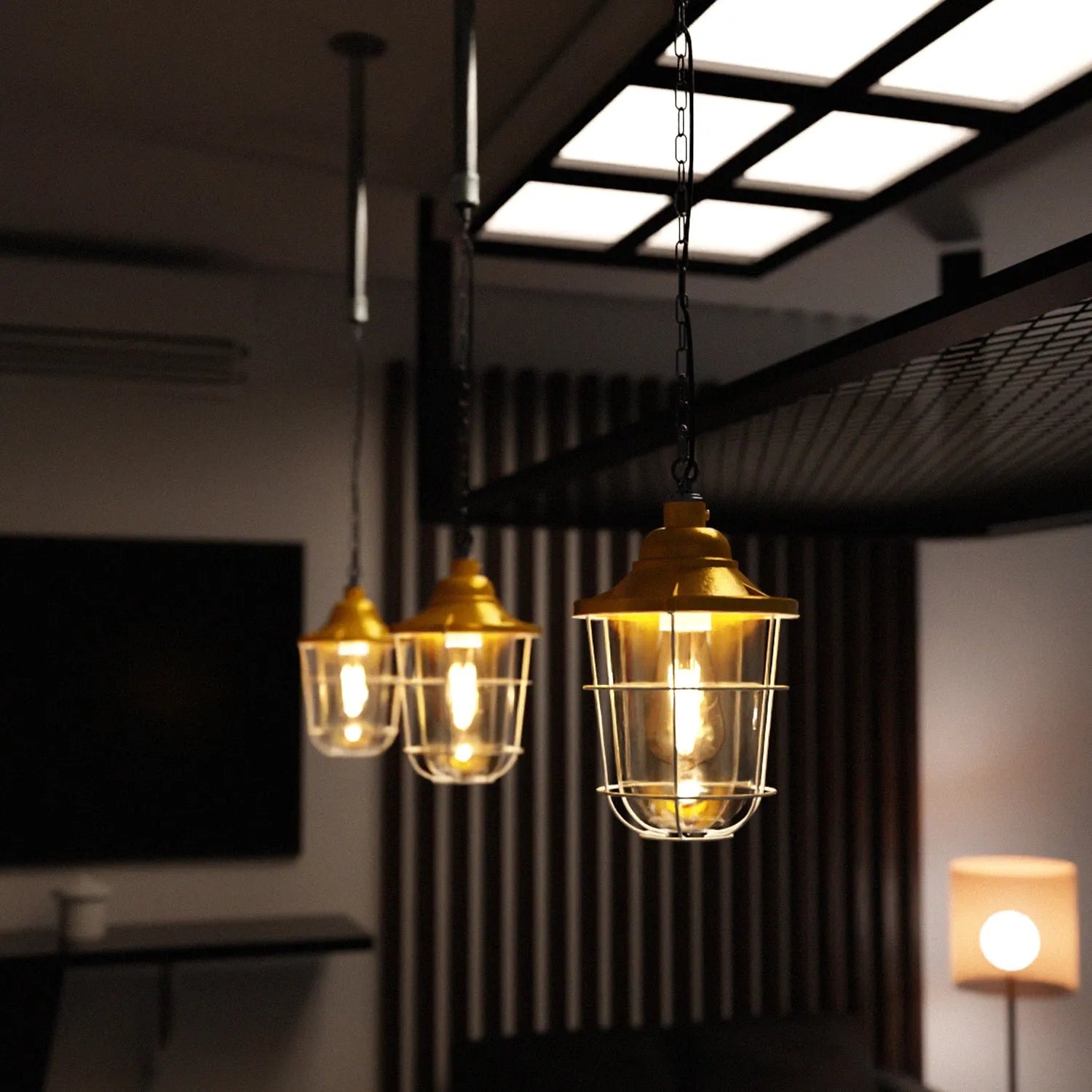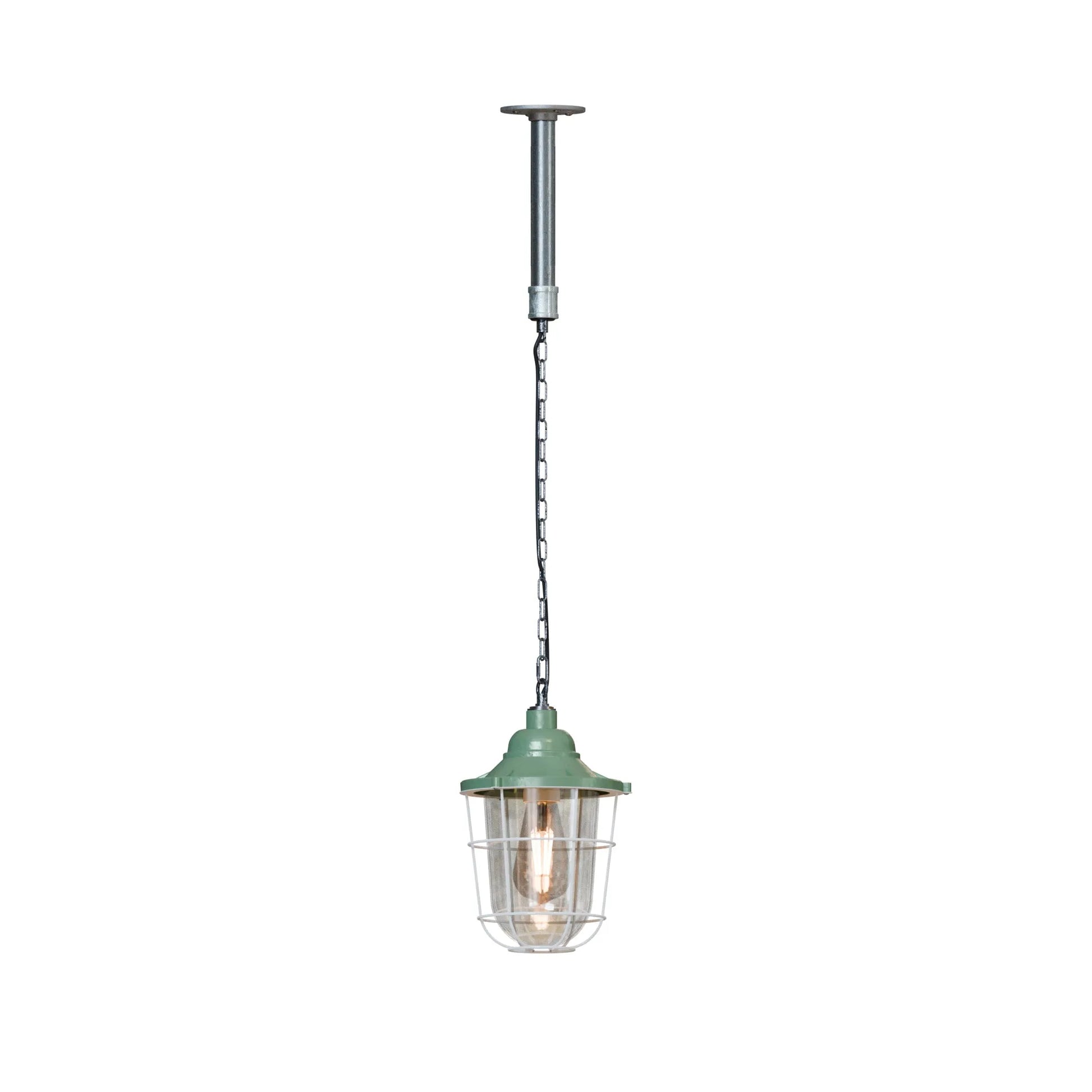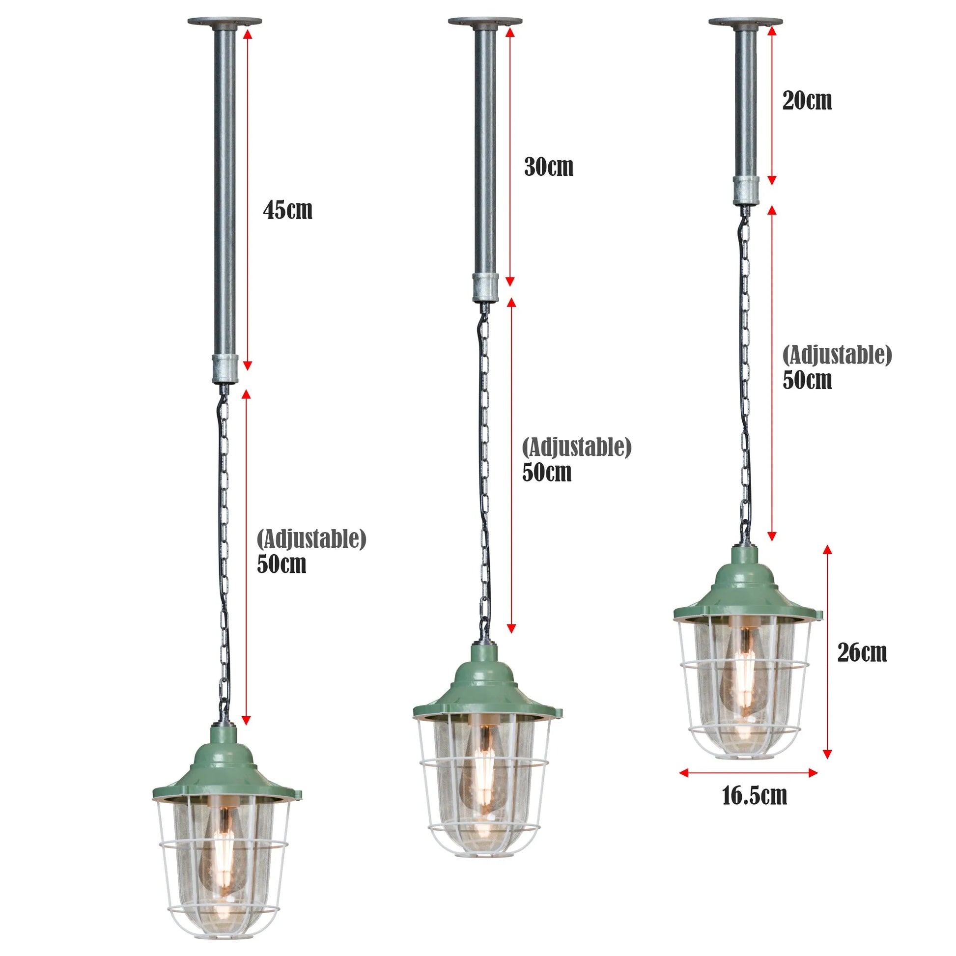- Klassische Conduit-Pendelleuchte im Industriestil mit einem robusten verzinkten Rohr und einem schützenden Käfigschirm, der Ihren Innenräumen einen Vintage- und dennoch modernen Touch verleiht.